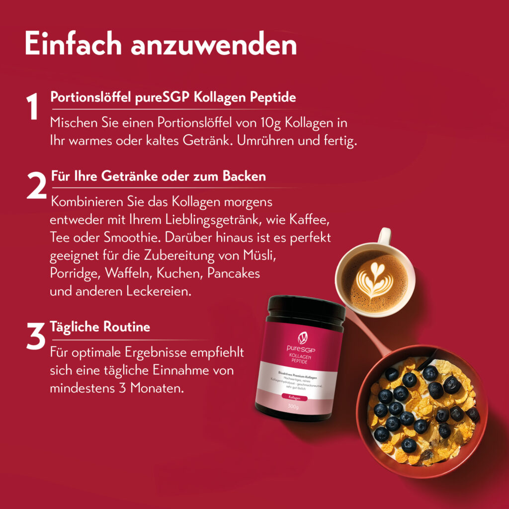 pureSGP® Kollagen Peptide ist geeignet, um eine kontinuierliche Versorgung mit wichtigen Nährstoffen zu unterstützen. Die angegebene empfohlene tägliche Verzehrmenge darf nicht überschritten werden.
